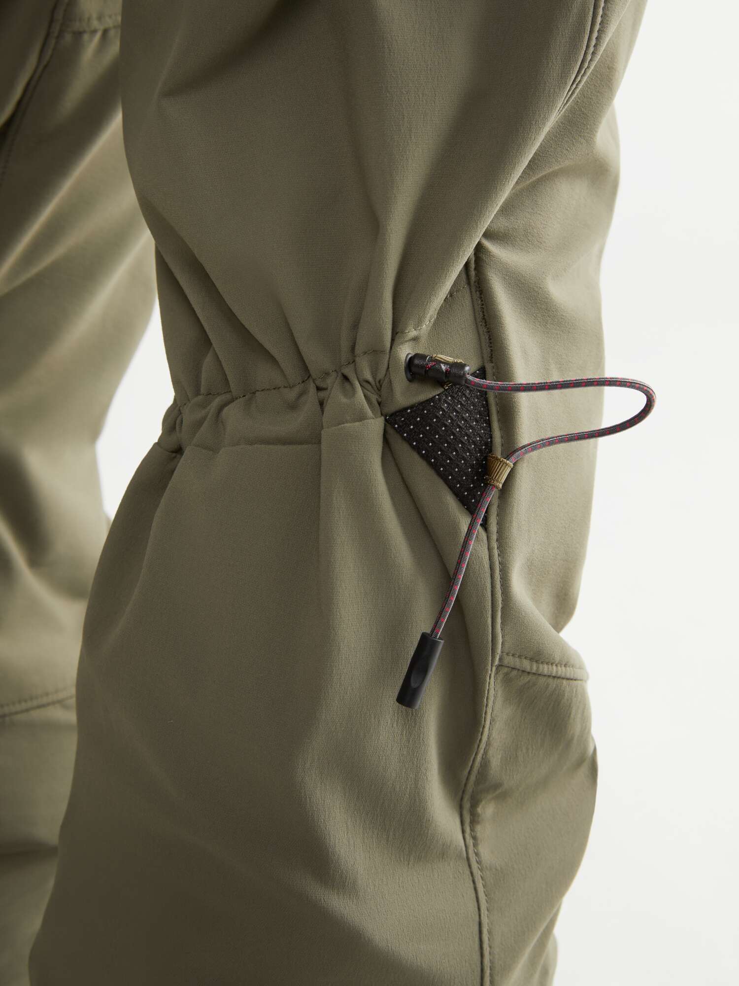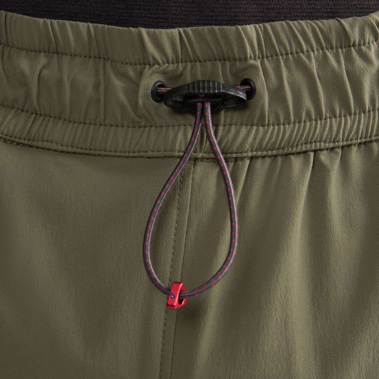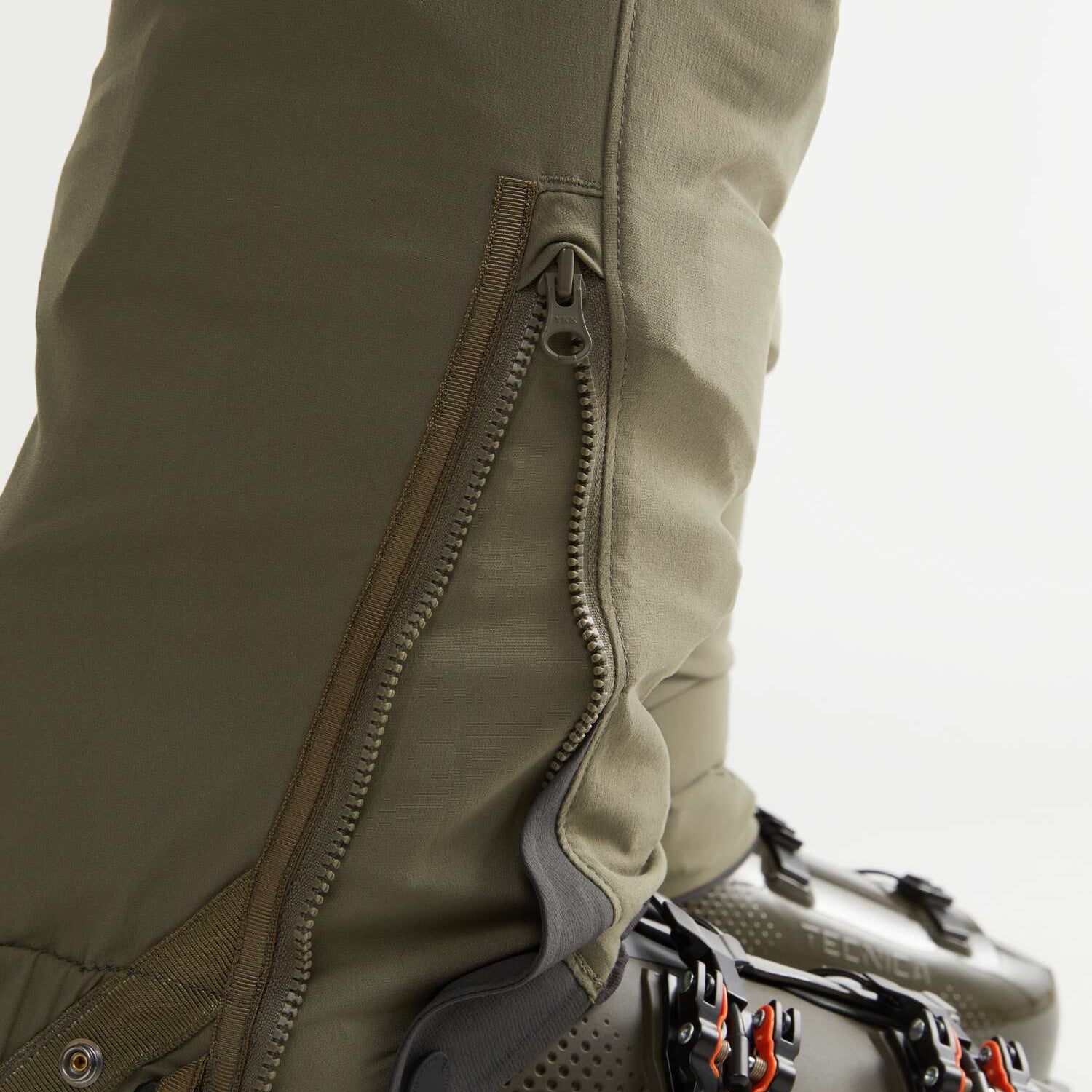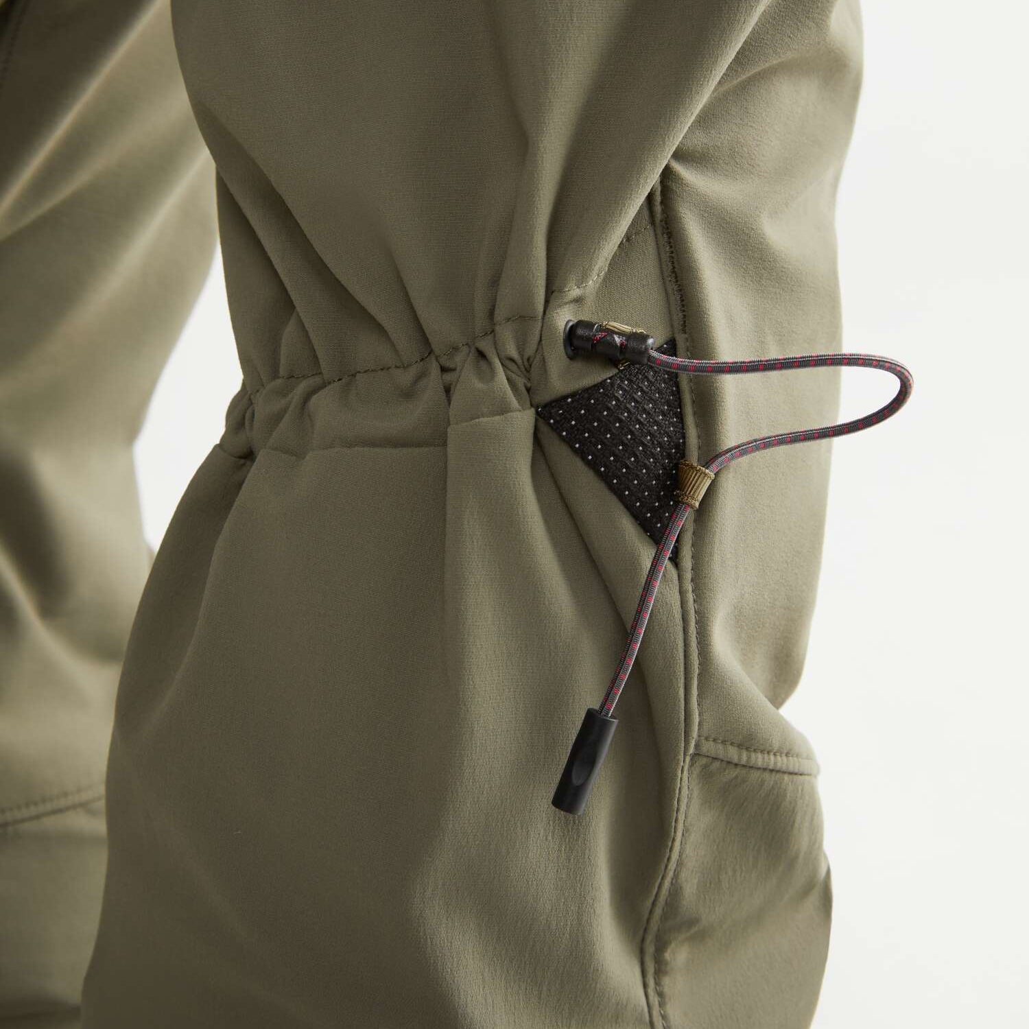 ファブリックは2層構造で作られています。アウターレイヤーは、柔軟性と耐久性に優れたエラスタンを配合した2ウェイストレッチのバイオベースポリアミドシェルです。内側のレイヤーは、速乾性に優れたリサイクル生分解性プリマロフト®ニットライナーで、保温性と通気性を実現しています。ライナーは動きに合わせてロフトを低くし、膝下まで覆うことで軽量化と快適性を実現しました。さらに、調節可能なゴム紐でフィット感を高め、貴重品を入れるジッパー付きポケットを装備しています。