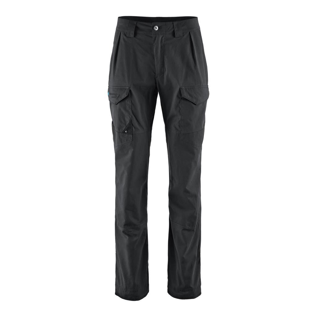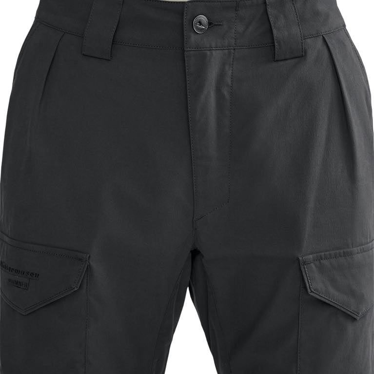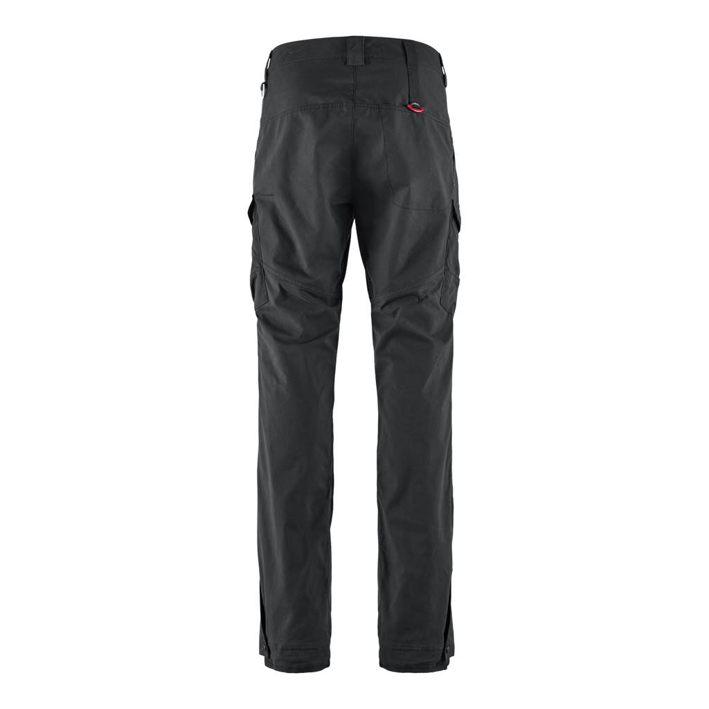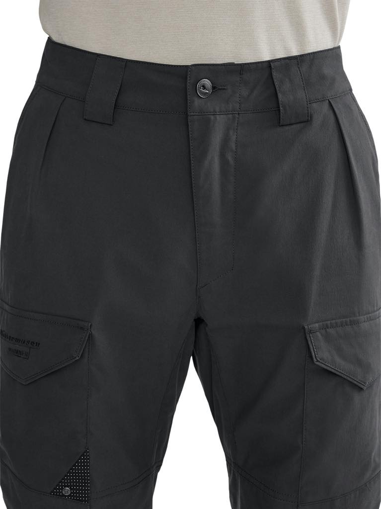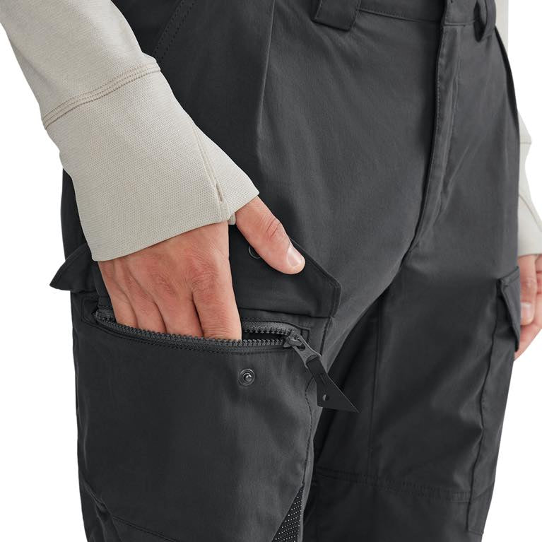 オーガニックコットンとポリアミドの混紡素材のオールラウンドテクニカルパンツ。アクティビティでも使用できる耐久性と細部の機能を兼ね備えながら、コットンのしなやかな履き心地で快適な環境を産み出します。ラフなトレッキングやキャンプに最適です。コットンはアウトドアに適さない、という神話は最新テクノロジーの前に過去のものとなりました。天然素材を羽織って自然の中を楽しむ、新しい時代のテクニカルプロダクツです。 スカンジナビアンスタイルのヘビーデューティなクラシカルスタイルは、広大な北欧のウィルダネスでの使用を想定して、膝やヒップのキーエリアに厚手のコットンベースの補強素材を配しています。大きなレッグポケットはジッパーとフラップ付きで、後ろのポケットはトグルで開閉します。裾には裾幅を調整するためのバックルが内蔵され、取り外し可能な靴ひも用フックも付いています。